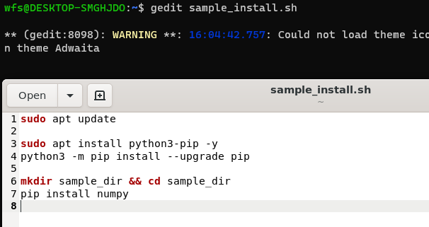 우선은 아래와 같이 간략하게 sh를 작성했다. gedit을 사용했지만 vim이나 visual studio code 등 다른 편집도구를 사용해도 상관없다.