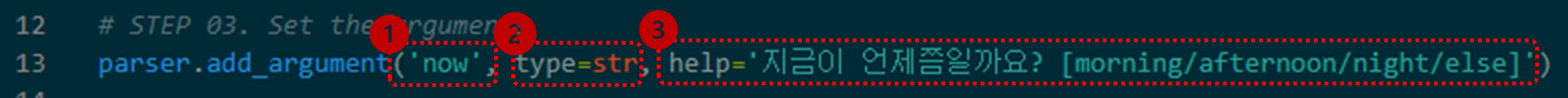 parser.add_argument('now', default='', type=str, help='지금이 언제쯤일까요? [morning/afternoon/night/else]')