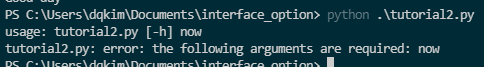 또한 이러한 첫 번째 방법은 sys.argv와 달리 반드시 입력해야 하는 값으로 입력하지 않으면 다음과 같은 에러를 일으킨다.