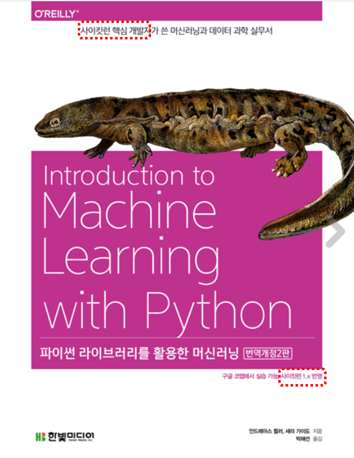 첫 번째는 '사이킷런 핵심 개발자가 쓴', 그리고 두 번째는 '사이킷런 1.x' 반영이라는 부분.