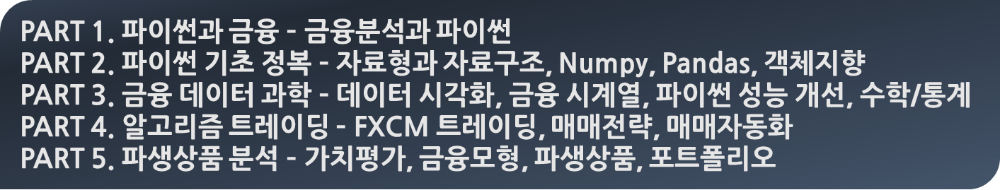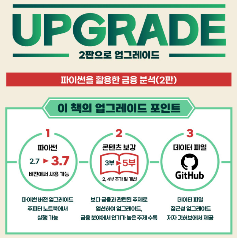 파이썬 3점대 버전을 사용할 수 있게 되었고, 금융공학을 전문하지 않은 독자들을 위한 양이 대폭 늘어났다.