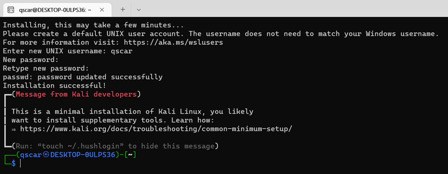 설치가 끝나면 계정을 만드는 과정으로 들어가며, 다음과 같이 잠깐의 대기 시간 이후 해당 배포 환경의 WSL에 들어갈 수 있다.